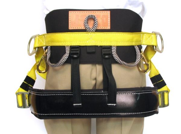 The padded seat band has an aluminium bar reinforcement. The 4 inch seat band has adjustors on each side and padded leg straps with mating buckles. 1 3/4 inch waist belt has a tongue buckle and 7 1/2 inch padded backpad. The belt is equiped with 3 tool loops on the back and 2 brass tool snaphooks, one on each hip.