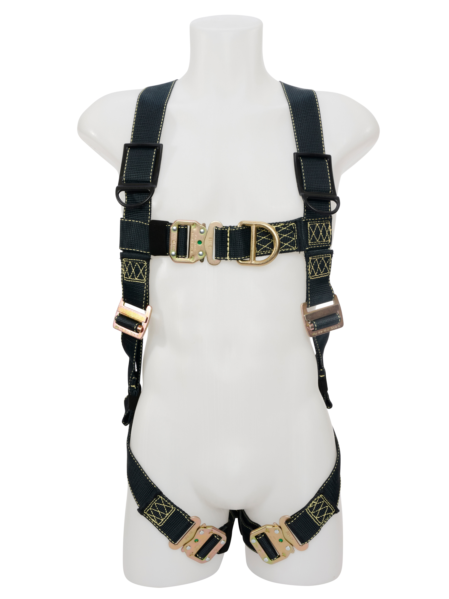 This model is constructed with Kevlar and steel hardware with leather tabs. This style harness will feature two torso adjustors to further assist in you getting the best fit for you. Steel quick connects are used on the chest strap and leg strap for ease of doning. The attachment points on the harness are a steel dorsal d-ring and sternal d-ring. All JELCO H-Style harnesses feature two breakaway lanyard keepers as well as two fall indicators.
