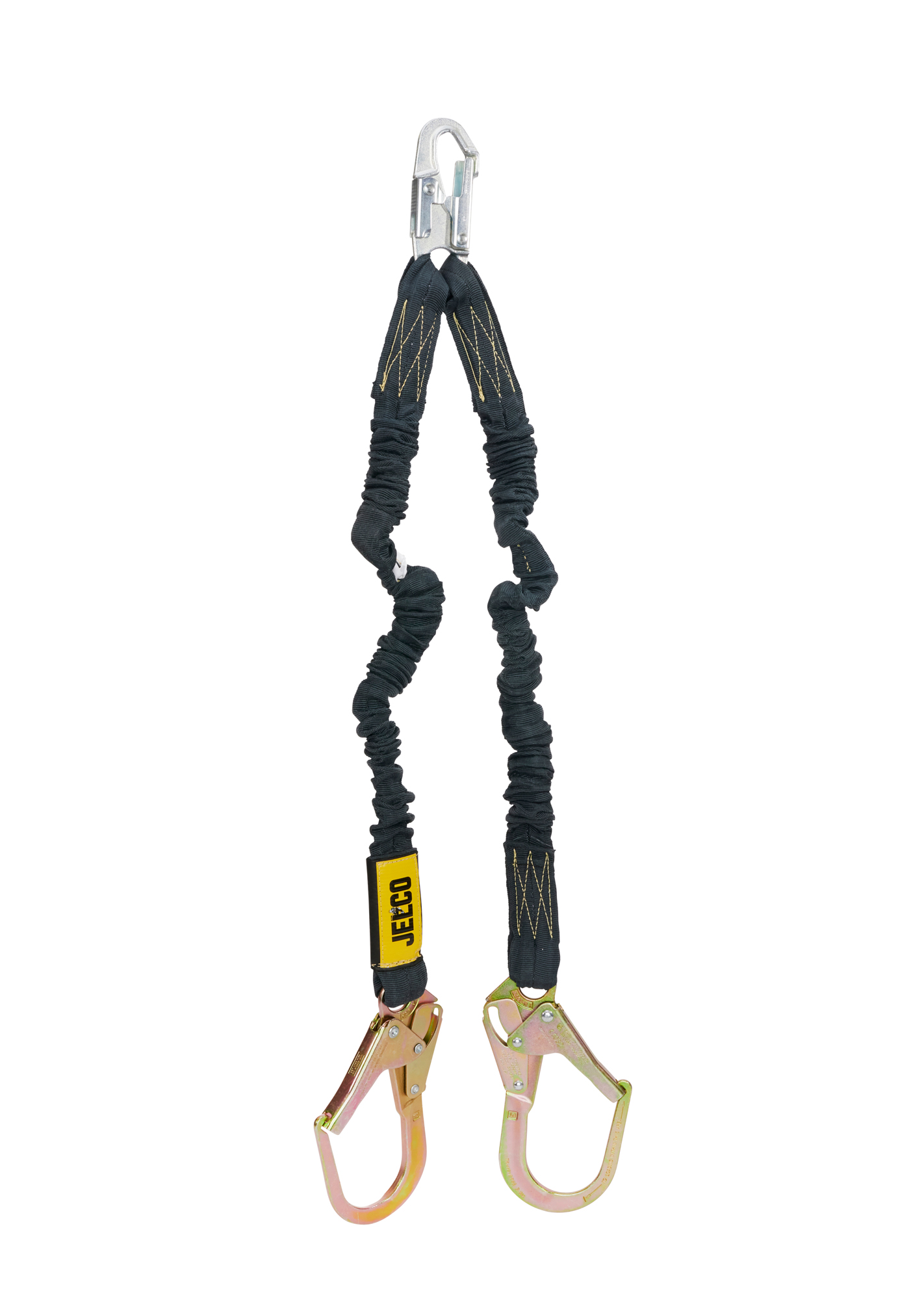 The JELCO arc flash compliant, twin leg, FLEX-NoPac energy absorbing lanyard is made with high strength nylon. The FLEX-NoPac feature allows the harness to expand and contract with the users movements and returning to the original length. The No-Pac design eliminates a bulky external ZORBER shock absorber. The unit is constructed of a durable nylon to resist abrasion and UV degradation. This model features a steel snap hook and two rebar hooks.