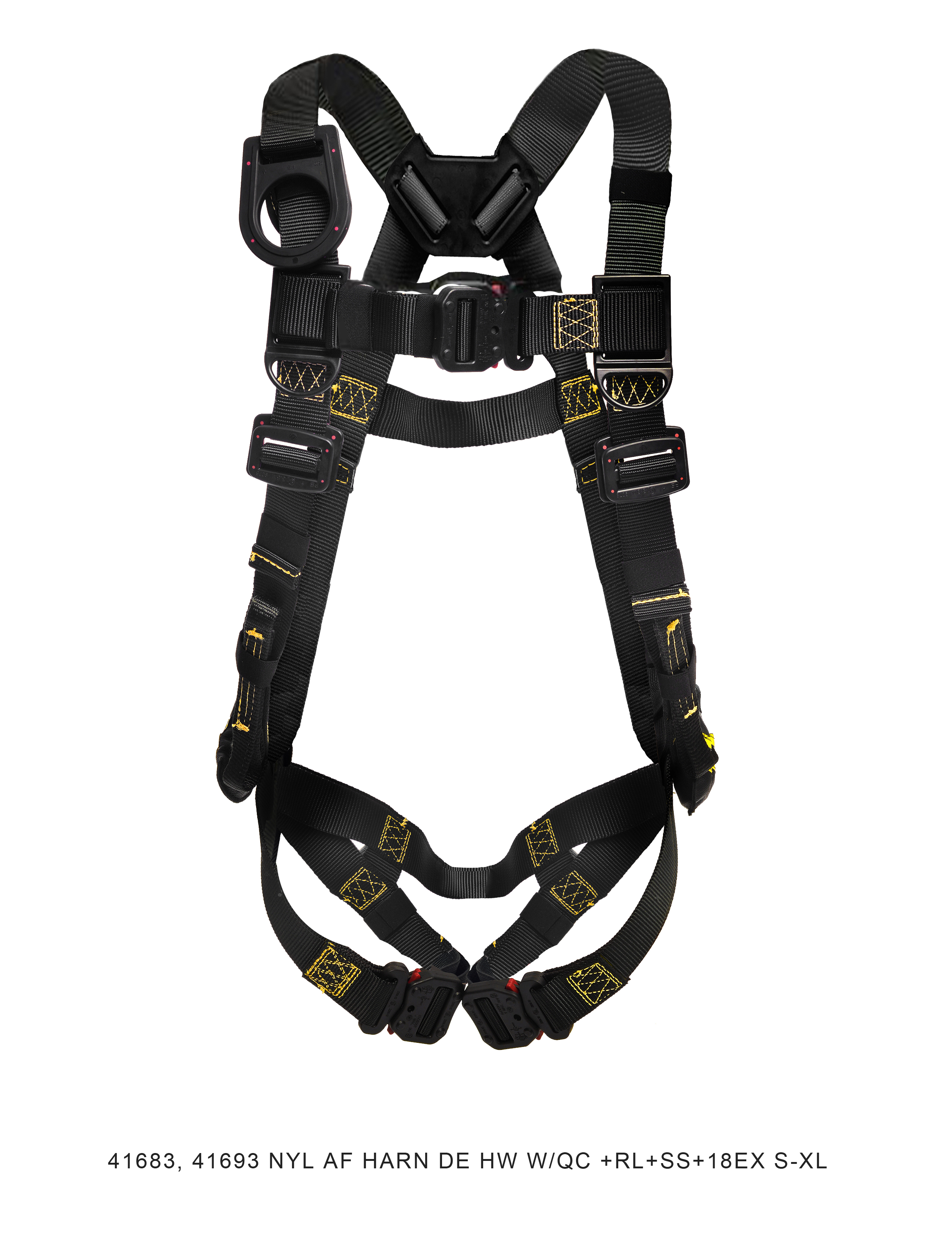 This model is constructed with high strength nylon and all dielectric hardware. This style harness will feature two torso adjustors to further assist in you getting the best fit for you. Dielectric quick connects are used on the chest strap and leg strap for ease of doning. The attachment point on the harness is an 18″ extension with a dielectric dorsal d-ring at the end. All JELCO H-Style harnesses feature two breakaway lanyard keepers as well as two fall indicators. Additional features include integrated rescue loops and suspension trauma relief straps.