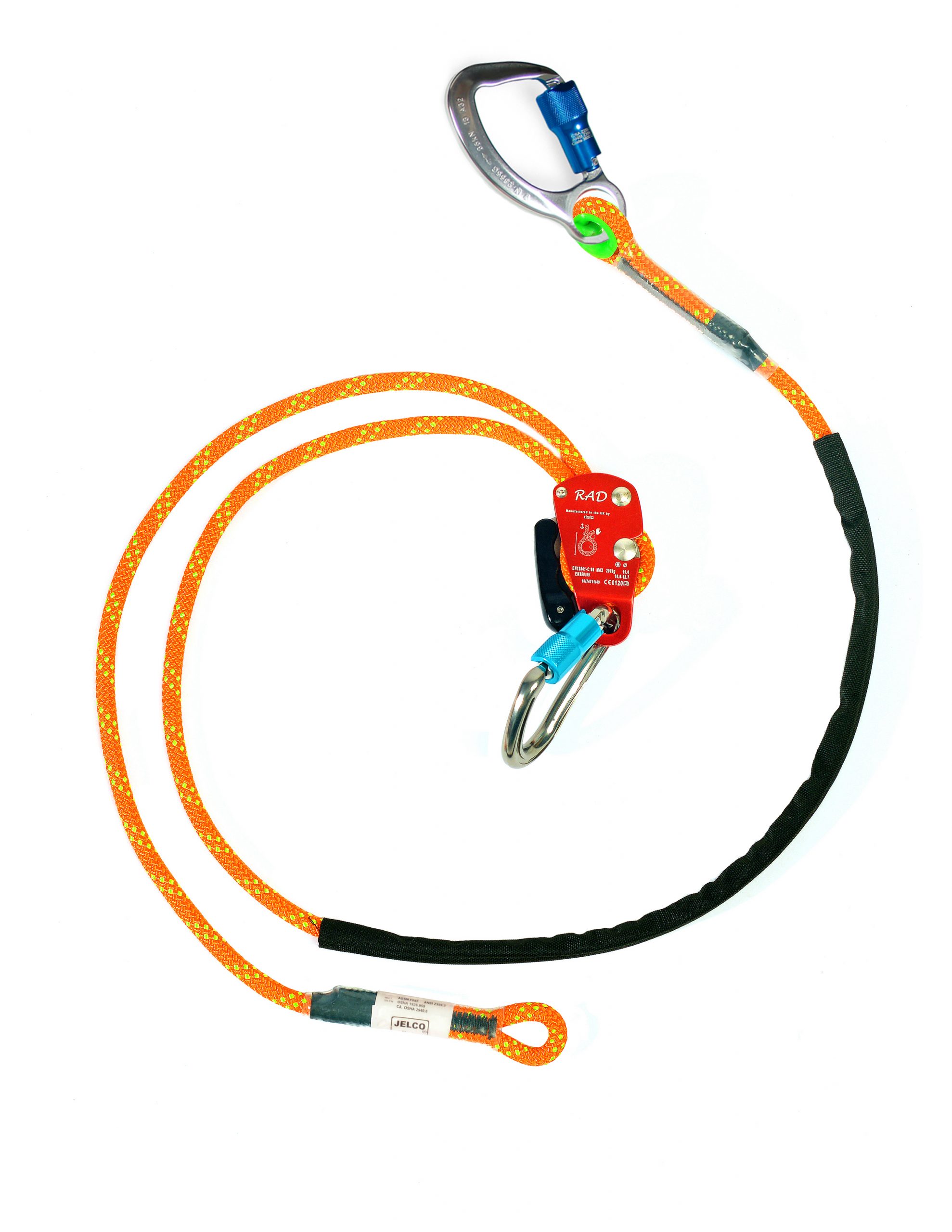 The JELCO adjustable positioning lanyard featuring the RAD allows the user to lengthen the rope with one hand and not have to remove weight from the device. This secondary safety is made of 7/16? Kernmantle rope and has a ballistic nylon protective sleeve. This model features an aluminum carabiner and carabiner.
